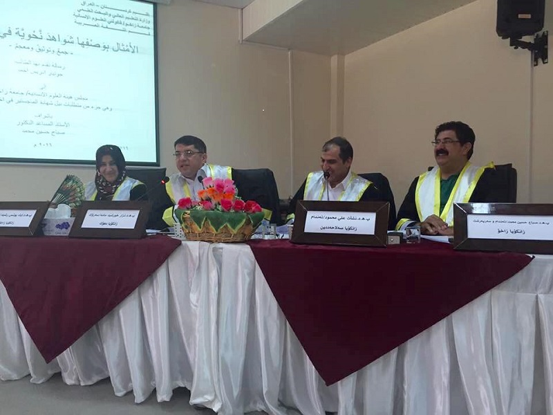 On Wednesday, the 17th of August, 2016 at 10:00 a.m. at the Seminar Hall of the Faculty of Humanities, the Masters Thesis Defense of Mr. Chwtiar Idrees Ahmed, a postgraduate student from the Department of Arabic language at the University of Zakho, on "Proverbs as evidence in the Millennium grammatical explanations - collecting , documenting and Lexicon." took place.