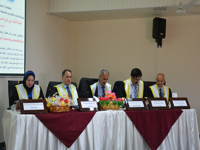 On Thursday, the 6th of October, 2016 at 10:00 a.m. at the Seminar Hall of the Faculty of Humanities, the Masters Thesis Defense of Mr. Bewar Ramadahan Muhammad, a postgraduate student from the Department of Arabic language at the University of Zakho, on "Hadiat Alahbab Fi Sharih Tabsirat Altulab Li Ibin Adam Al-Balky (died 1260 AH)." took place.