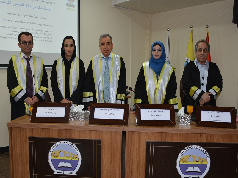 A master thesis was discussed on Thursday 6th of July 2017, at 9:00 a.m. in the hall of Khalil Kheyali at the University of Zakho. The master thesis was presented by Mrs. Iman Jamil Mihyedin, who is studying in the History department at the University of Zakho. The title of her research was "Khabeer Area in the Ancient Centuries .