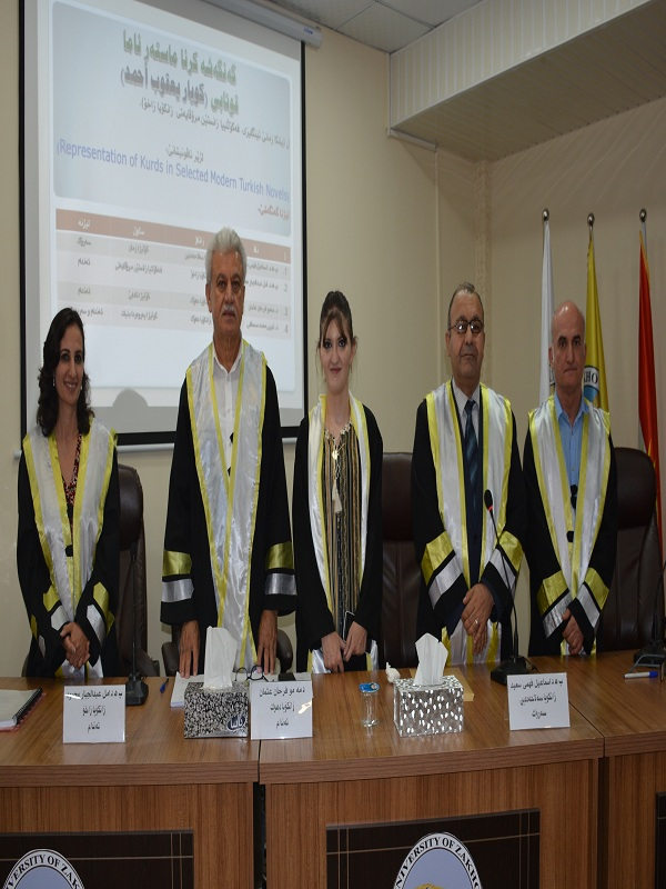 On Monday, 28th August 2017 at 8:00 am, a master thesis was prepared by (Koyar Yacoub Ahmed), a graduate of the Department of English Language / University of Zakho at the Khalil Khayali Hall of the Faculty of Humanities at the University of Zakho. Her thesis was entitled "Representation of Kurds in Selected Modern Turkish Novels".